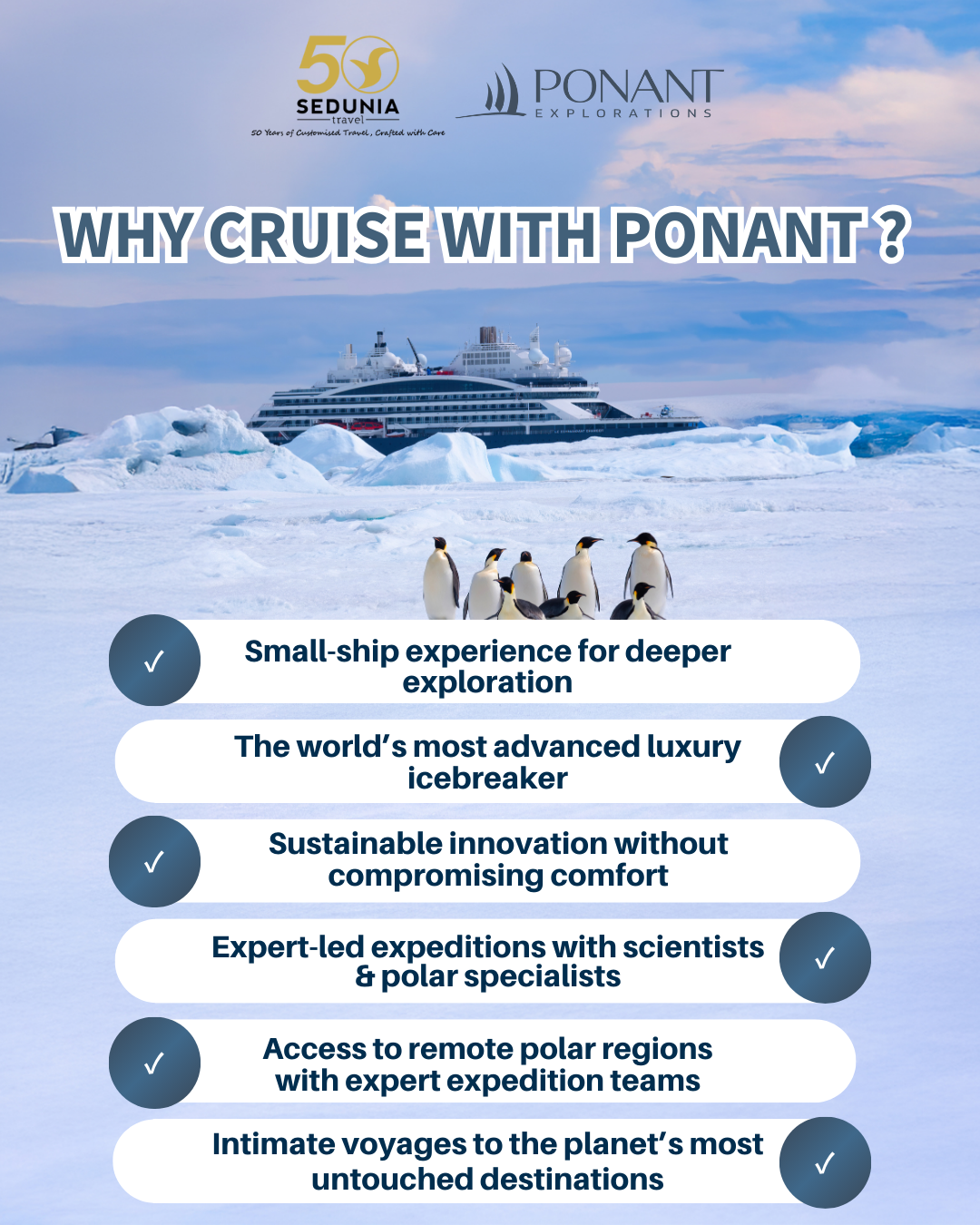 Journey beyond the ordinary with Ponant. Explore Antarctica, encounter emperor penguins, and discover polar exploration at its finest. Reserve your seat for our 2026 Polar Expedition Cruise Talk.