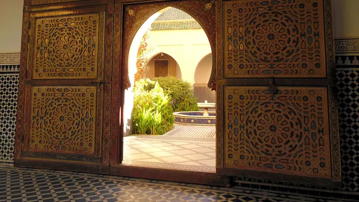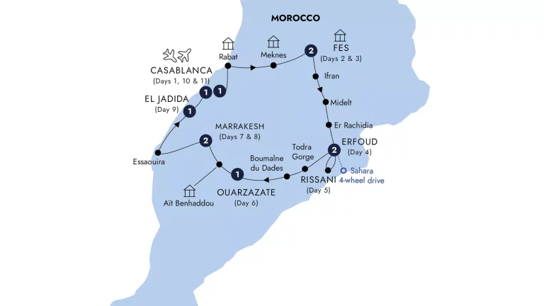 Begin your day viewing the Hassan II Mosque in Casablanca, one of the largest in the world, dramatically set on the Atlantic shore. Drive along the Corniche before travelling to Rabat. See the Royal Palace, then visit the Mausoleum of King Mohammed V, a masterpiece of Alaouite architecture housing the tombs of the king and his two sons. Nearby, view the Hassan Tower, the incomplete minaret of a 12th-century mosque. Continue to Meknes, one of Morocco’s imperial cities. Pause at Bab el-Mansour, the monumental city gate currently under restoration, its intricate tilework and scale still impress. Arrive in Fes for a traditional Moroccan dinner in an ancient palace near the Medina, accompanied by live music and folkloric entertainment.
