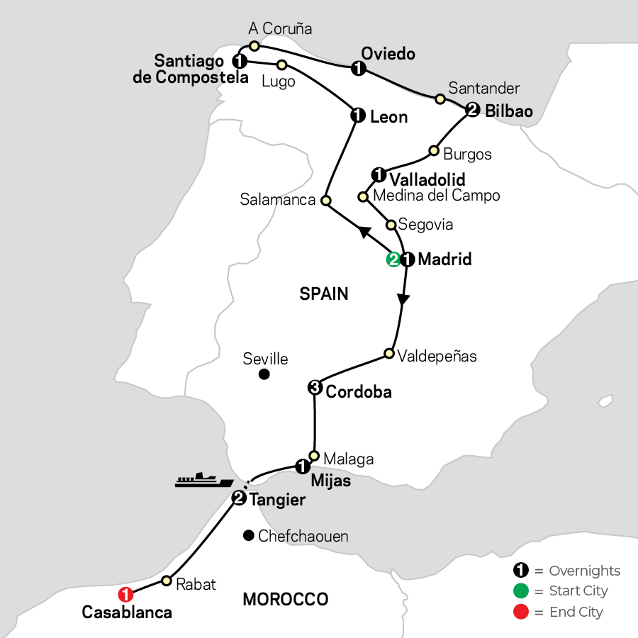 Experience the best of Spain from north to south and get a taste of Morocco on this unforgettable affordable tour from Madrid to Casablanca. Discover Northern Spain’s hidden gems, including Santiago de Compostela, Burgos, and Segovia, before heading south to explore the vibrant region of Andalusia. Visit Córdoba’s stunning Mezquita and Picasso’s birthplace, Málaga, on the sunny Costa del Sol. Cross the Strait of Gibraltar to experience the rich culture and charm of Morocco. From Spain’s historic cities to Morocco’s exotic allure, enjoy a journey filled with diverse scenery, flavors, and traditions.