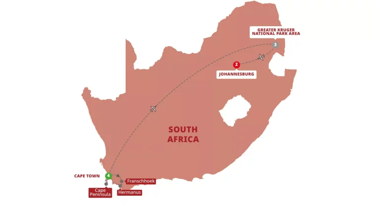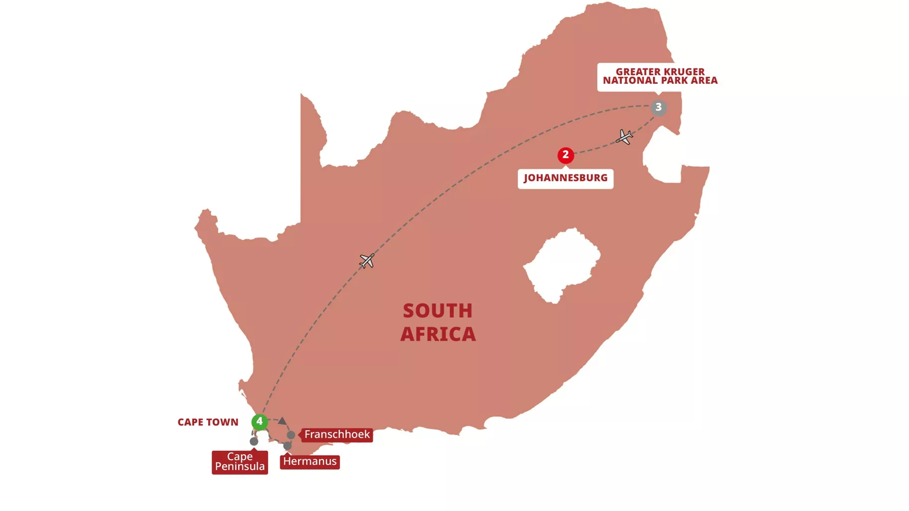 - Visit Table Mountain by cable car (weather permitting) and Bo-Kaap in Cape Town, Cape of Good Hope, Franschhoek, Hermanus, the Karongwe Private Game Reserve, the Constitutional Hill, Mandela House Museum and the Regina Mundi Church in Johannesburg