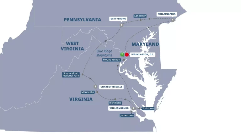 • Visit Mount Vernon, the National Mall in Washington, D.C.,  Jamestown, Colonial Williamsburg, St John’s Church in Richmond, Monticello,  Shenandoah National Park, Gettysburg National Military Park, Independence National Historic Park and National Constitution Center in Philadelphia