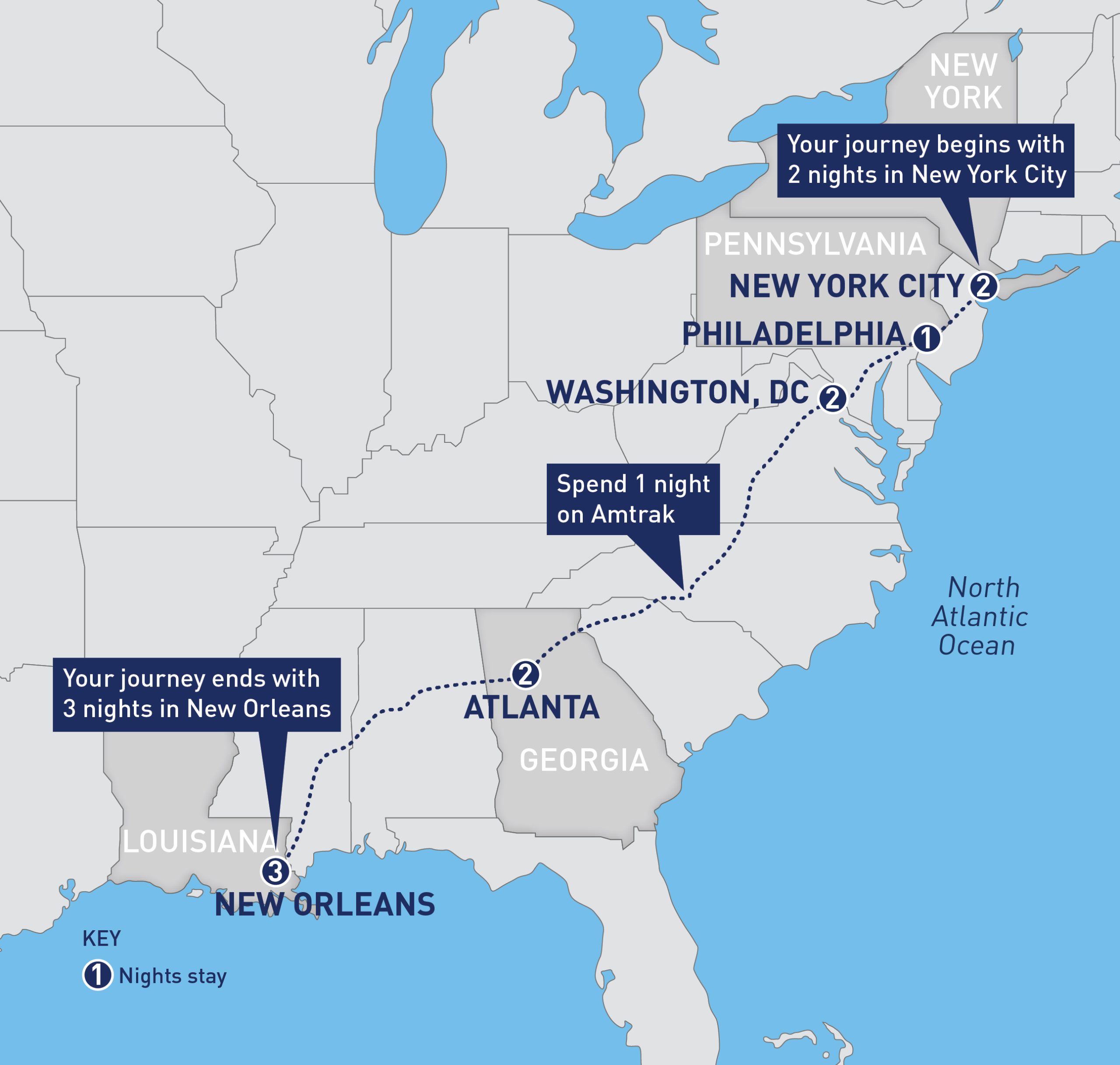 - One-way Amtrak® in Coach accommodations from New York to Philadelphia, Philadelphia to Washington, D.C.on the Northeast Regiona®l; Washington, D.C. to Atlanta, Atlanta to New Orleans on the Crescent®