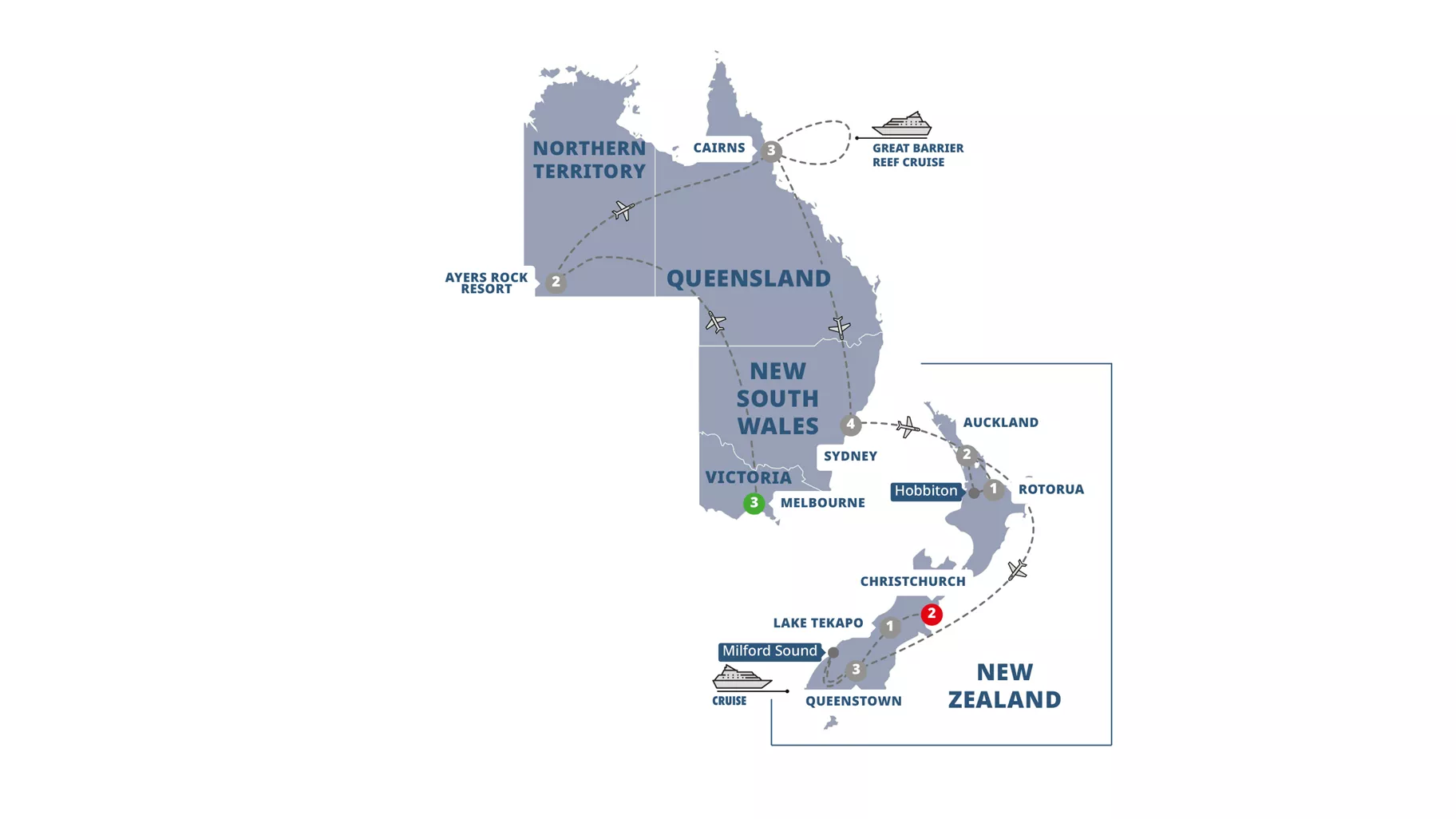 • Intra-Air Flights: Melbourne to Ayers Rock, Ayers Rock to Cairns, Cairns to Sydney, Sydney to Auckland, Auckland to Queenstown.