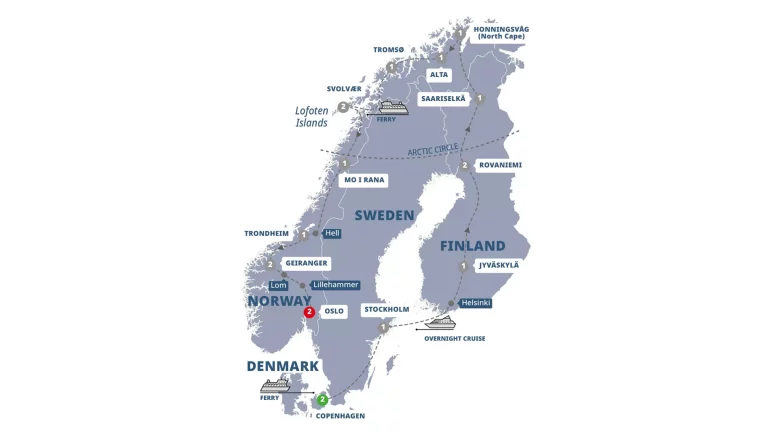 - See the Christianborg Palace, the Little Mermaid and the Borsen in Copenhagen, Sibelius Monument, the Olympic Stadium, the Opera House and Finlandia Hall in Helsinki, the ‘Blood Road’, Saltfjellet-Svartisen National Park, Junkerdal National Park, Nidaros Cathedral, the Old Town Bridge and Kongens gate in Trondheim, Akershus, the Opera House and the Royal Palace in Oslo