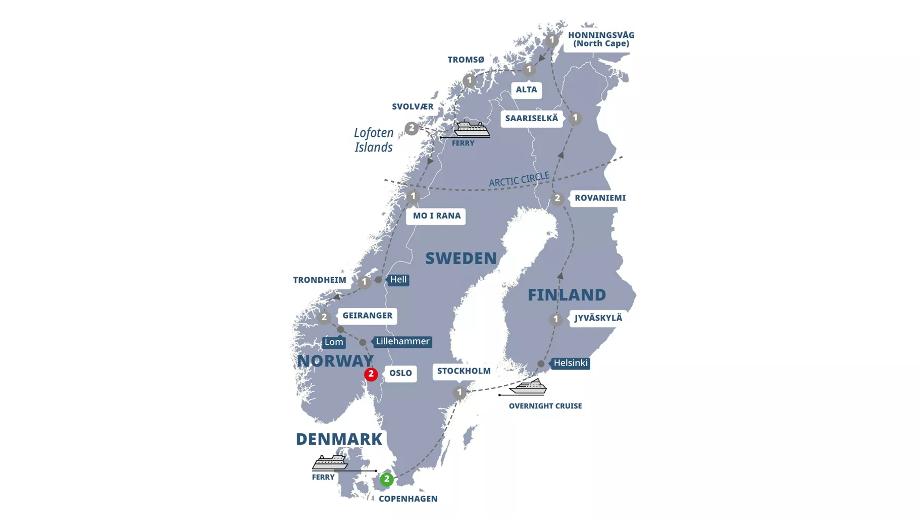 - Visit City Hall in Stockholm, Santa Claus Village, Saariselkä, Honningsvåg, North Cape Visitor Centre, Alta, Tromsø, Svolvær, Geirangerfjord, the Stave church in Lom, Lillehammer and Vigeland Sculpture Park in Oslo