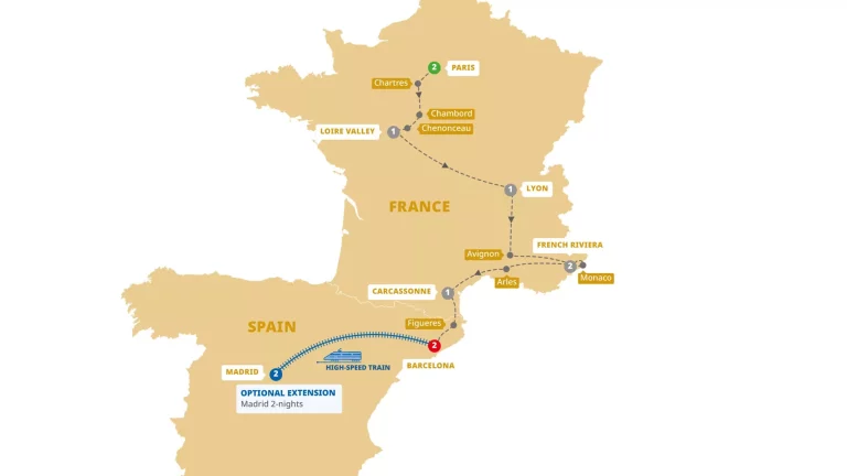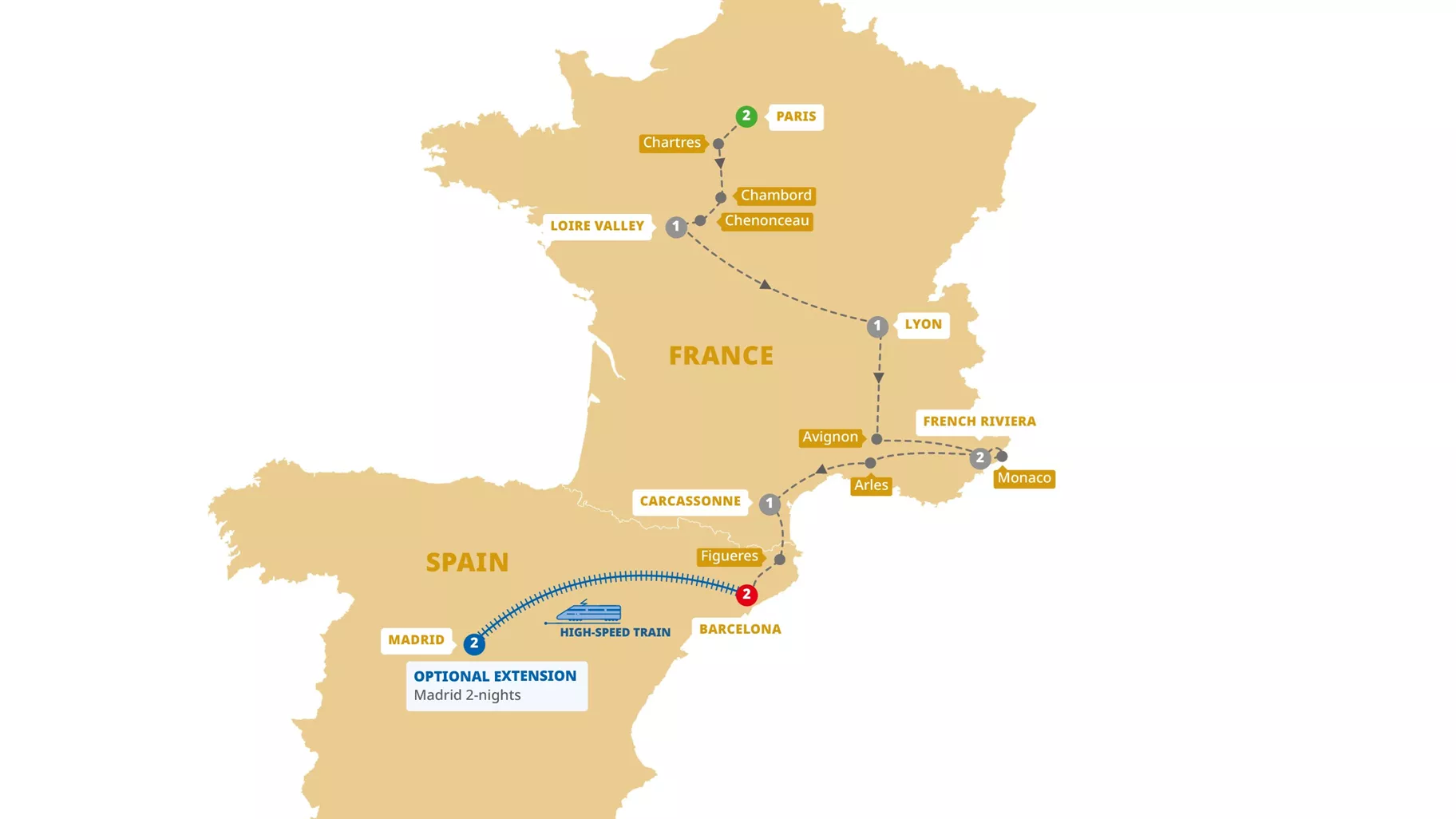 - Explore Paris, Lyon, Carcassonne and Barcelona