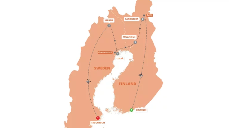 Today is yours to explore Kiruna, a fascinating town undergoing one of the most ambitious urban relocations in modern history. In a remarkable feat of engineering, much of the town — including its historic buildings — is being methodically moved 3 kilometres east to accommodate the growth of the world’s largest underground iron ore mine. You might choose to explore at your own pace, or perhaps join one of our enriching Optional Experiences. Take a husky safari through the snow, or if conditions don’t allow, visit a working sled dog kennel to learn about life with these remarkable animals. Explore the Icehotel, built entirely from natural ice and snow, or join a local guide to learn more about Kiruna’s ambitious move. End the day with an evening Optional Experience to Aurora Camp, where a two-course dinner is served beside the frozen river as you watch for the northern lights.