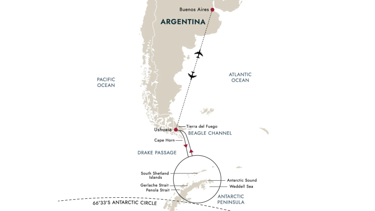 Fly to Ushuaia, the gateway to Antarctica and the capital of Argentina’s Tierra del Fuego Province. Set against the dramatic Andes, this southernmost city marks the start of your voyage. Board your hybrid-powered expedition ship, meet your Expedition Team, and settle in as your polar adventure begins.